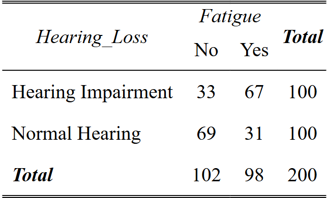 - We can look at the relationship between “Hearing Loss” and “Fatigue” by comparing the counts across the “Hearing Loss” rows. For instance, among participants with “Hearing Impairment,” 67 individuals experience fatigue (“Yes”), while 33 do not (“No”).