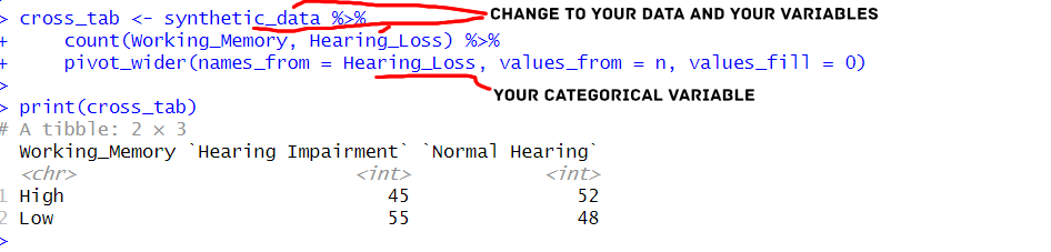 function to calculate the frequency of observations. Specifically, we do this for each combination of ‘Working_Memory’ and ‘Hearing_Loss’. Then, we used the pivot_wider()
