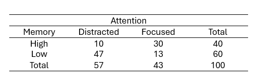 This cross-tabulation suggests a potential relationship between memory capacity and attention. Participants with high memory capacity are likelier to maintain focused attention, whereas those with low memory capacity are likelier to be distracted. The following section will teach us how to create a cross-tabulation in R.