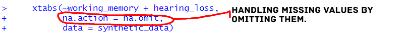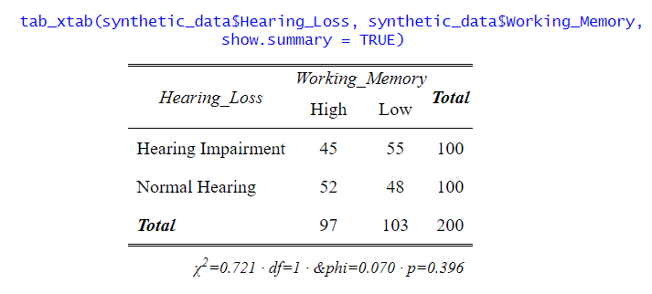 function to create a cross-tabulation between the “Hearing_Loss” and “Working_Memory”. The show.summary = FALSE