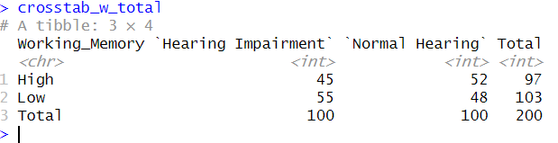 to append additional rows representing row and column totals. We achieved this by first grouping the data by “Hearing_Loss,” summarizing the counts with sum()