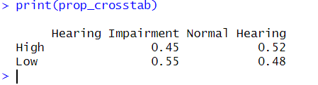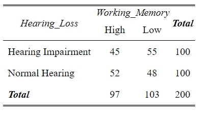 function to reshape the data, creating columns for “Hearing Impairment,” “Normal Hearing,” and their respective row and column totals. Here is the resulting table: