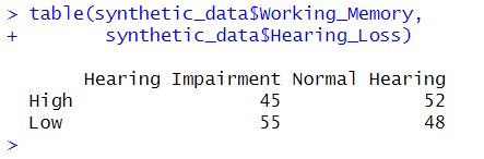 This code chunk generates a comprehensive cross-tabulation table with row and column totals, offering a comprehensive view of the data distribution across “Hearing_Loss” and “Working_Memory” categories.