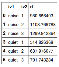 Typically, a researcher is interested in the descriptive statistics of the IVs. Therefore, we group the data by these (i.e., iv1, iv2). Again, using the describe method on the grouped we get summary statistics for each level in each IV.