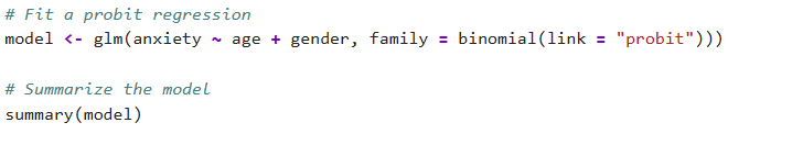 - In a study investigating the effect of age and gender on the likelihood of experiencing anxiety, researchers may use probit regression to model the relationship between age, gender (predictor variables), and the likelihood of experiencing anxiety (binary response variable).