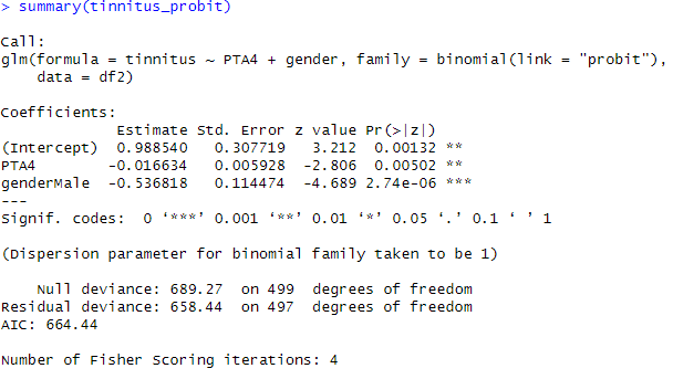tinnitus_probit <- glm(tinnitus ~ PTA4 + gender, family = binomial(link = "probit"),