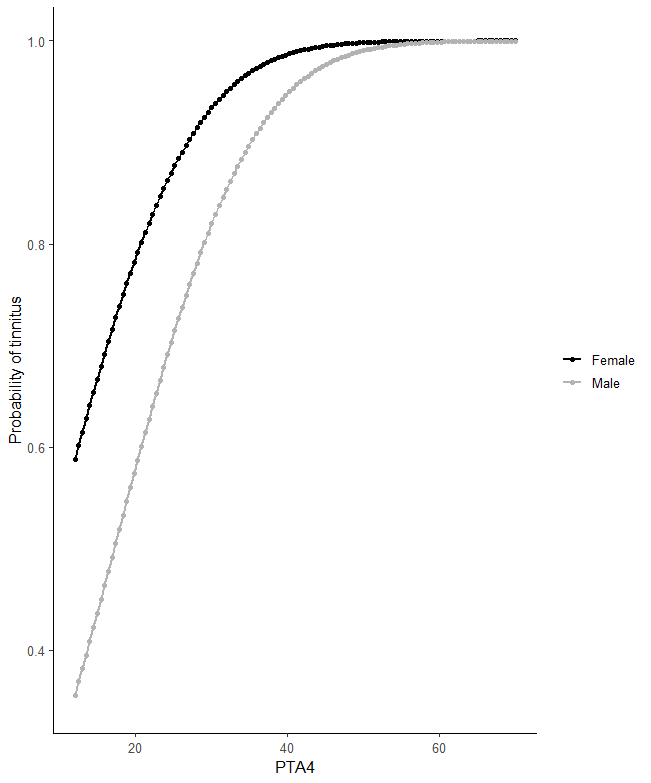 and the y-axis represents the predicted probability of tinnitus. We color the points based on gender using the “color” aesthetic.