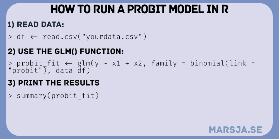 To illustrate how to perform probit regression in R, we have generated example data and provided the R syntax for running the model. We have also demonstrated how to visualize the model using the ggplot2 package.