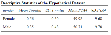 Suppose we have collected data from 500 participants with hearing loss to investigate the relationship between hearing loss and tinnitus. In the study, we also collected audiogram data and calculated the pure-tone audiogram (PTA) at four frequencies (e.g., 500 Hz, 1000 Hz, 2000 Hz, and 4000 Hz). Additionally, we obtained demographic information, including the gender of each participant. Using this data, we aim to investigate the association between PTA4 and tinnitus presence, taking into account gender. Finally, we collected self-reported tinnitus symptoms on a binary scale (yes or no). Here, we simulate this hypothetical data: